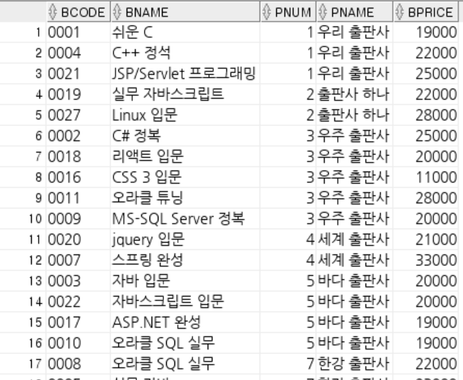 SELECT bCode, bName, book.pNum, pName, bPrice
