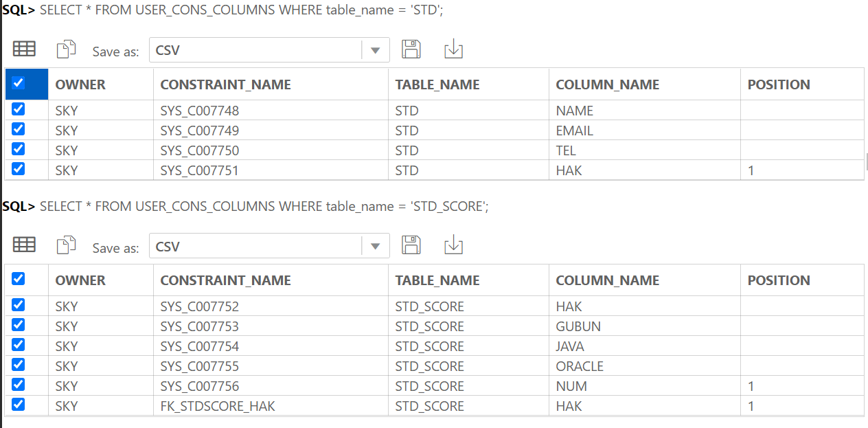 SELECT * FROM USER_CONS_COLUMNS WHERE table_name= 'TEST1';