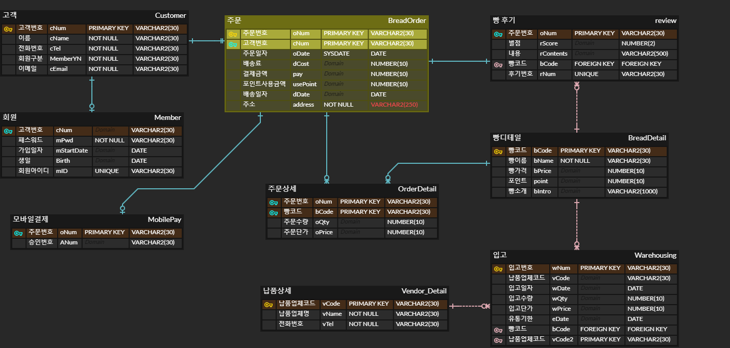 납품업체 하나에 (부모테이블) 입고(자식테이블) 이 여러개가 존재할 수 있다. 참조키로 납품업체 코드를 해놨다. 그래서 납품업체 삭제는 거의 사용하지 않을 듯. 입고를 한번이라도 했으면 삭제해도 자식 레코드는 재고를 위해서 사용해야되서.