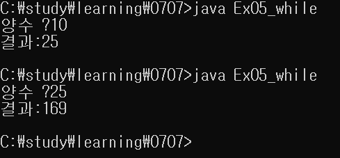 | 0707_Ex05_while : 양의 정수를 입력 받아 입력받은 정수까지 홀수합구하기 (0) | 2021.07.07 |